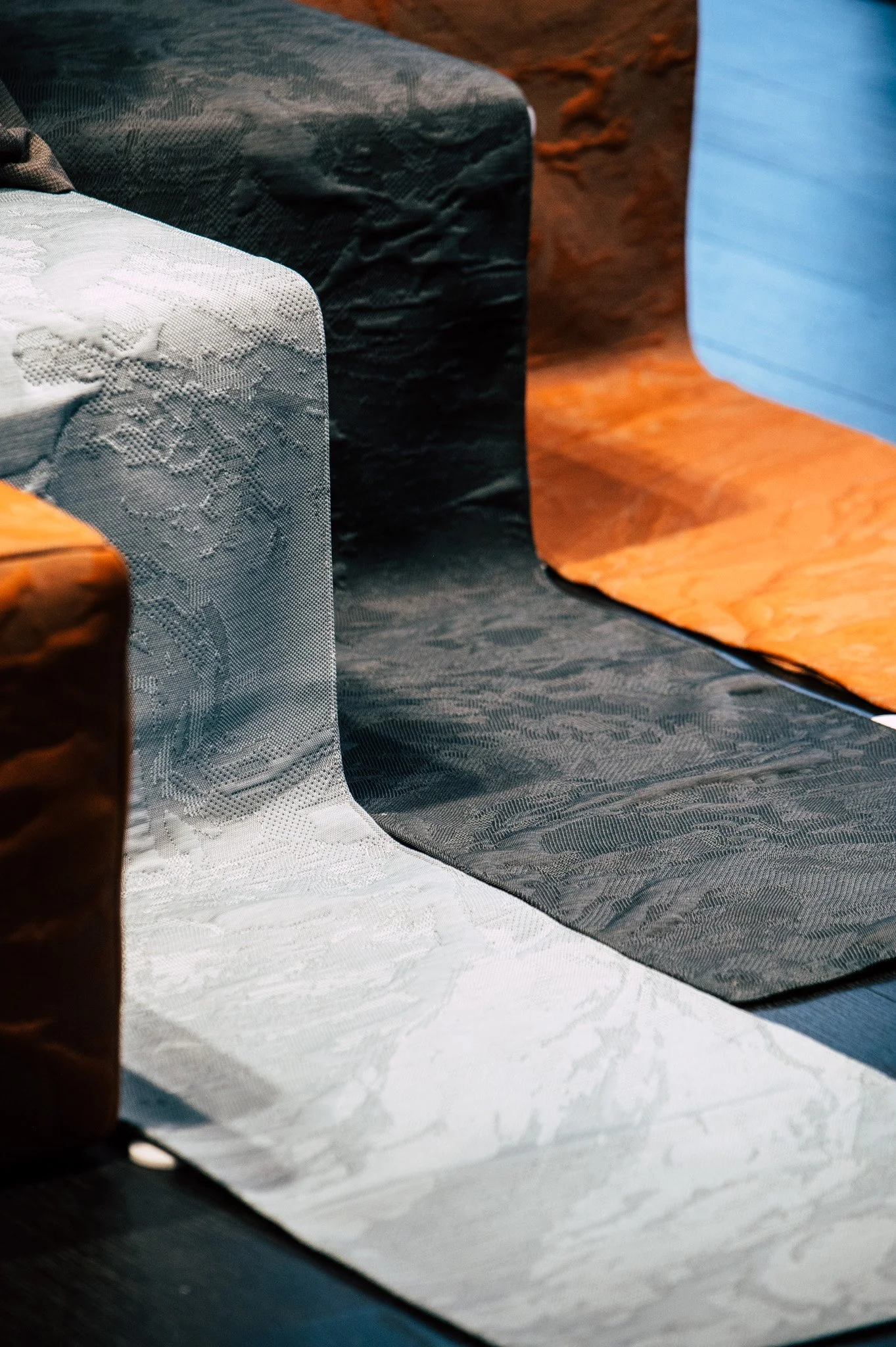 Our approach to this installation is multi-faceted: it's about crafting beauty and utility from a tapestry of diverse elements. We delve into material innovation, shaping fabric into a three-dimensional form that represents the convergence of varied identities and experiences. This fabric, crafted from a blend of premium wool and recycled PES, reflects the fluid elegance of water, embodying the fusion of sustainability and luxury.
